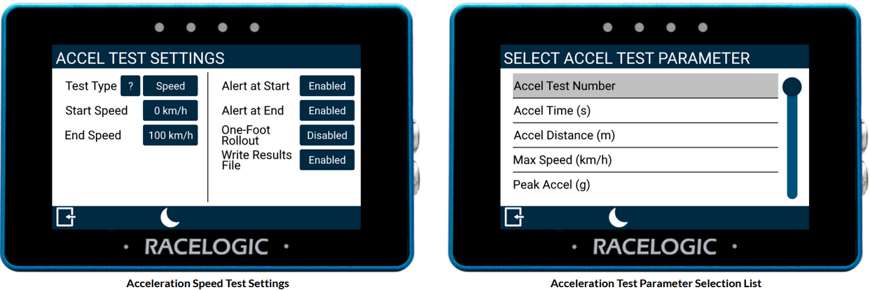 Users can now configure speed, distance or 0-Speed-0 tests, along with test start/end alerts, enable one-foot rollout, and write test results directly to an SD card inserted in the MFD Touch. Acceleration test parameters can be displayed on multiple data screens, allowing them to be monitored in real-time.