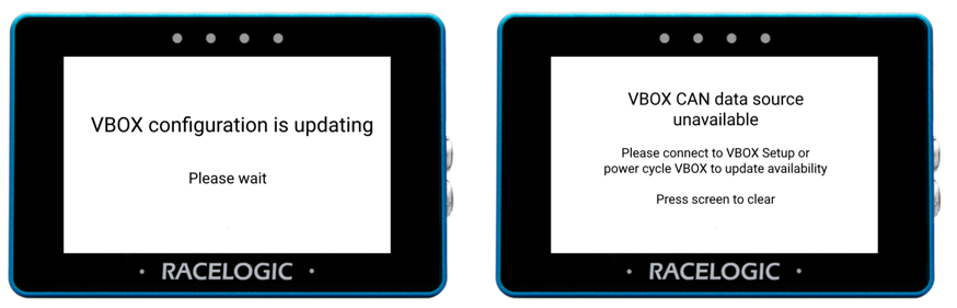 A number of alerts and user feedback screens have been added to allow for a better understanding of the behaviour of the MFD Touch and connected VBOX 3i. These include a logging beep, a 'No CAN' feedback screen, along with start and end alerts for acceleration tests.
