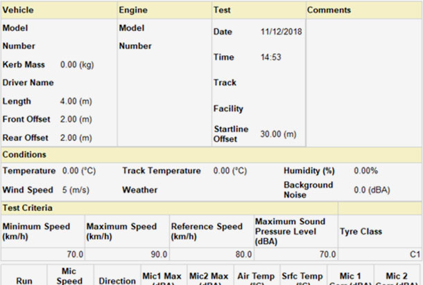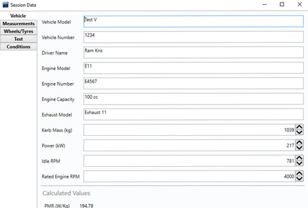 Testbedingungen und Fahrzeug-Details können für jeden Testlauf definiert werden. Dies umfasst erforderliche Felder wie Leermasse, Leistung, Leerlaufdrehzahl und Motorendrehzahl. Die Information wird automatisch in einer Protokolldatei gespeichert und kann immer wieder verwendet werden, wodurch Einrichtungszeit gespart wird.
