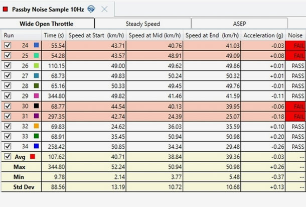 Mit der Software können Sie die maximalen Schallpegel für die Tests mit Vollgas und konstanter Geschwindigkeit festlegen. Außerdem werden im Ergebnisbereich automatisch Registerkarten erstellt, um zwischen WOT, konstanter Geschwindigkeit und ASEP-Läufen zu unterscheiden.