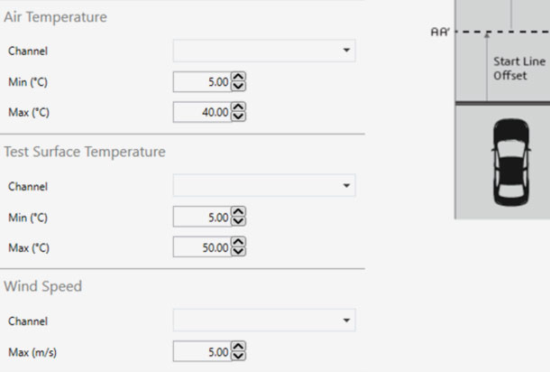 Bei Verwendung einer Wetterstation oder zusätzlicher Sensoren können Datenpunkte wie Lufttemperatur, Reifenoberflächentemperatur und Windgeschwindigkeit gemessen und in die Pass/ Fail-Kriterien aufgenommen werden.