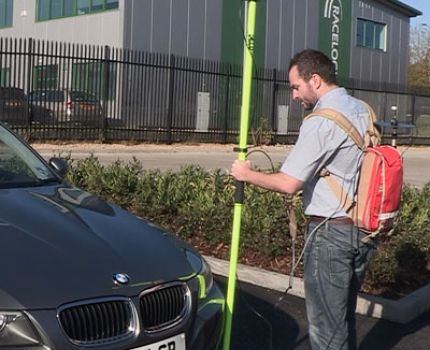 VBOX ACC test equipment will measure the time gap and separation between both vehicles accurate to within a cm. For high accuracy sampling of the curved lane we have developed the survey trolley, a line mapping rover wheel which comes with a custom rucksack containing radios, antenna and groundplane.