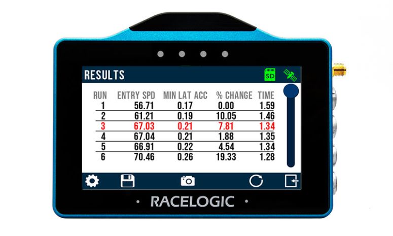 See live speed, lateral acceleration, and test results after each run.