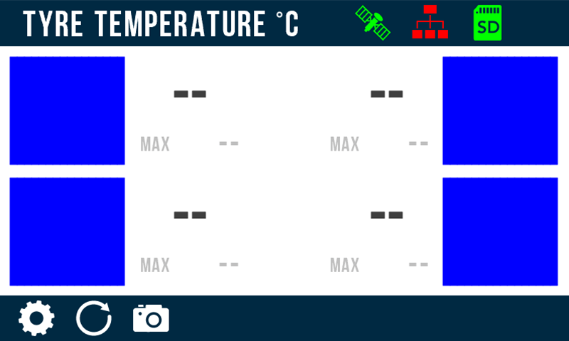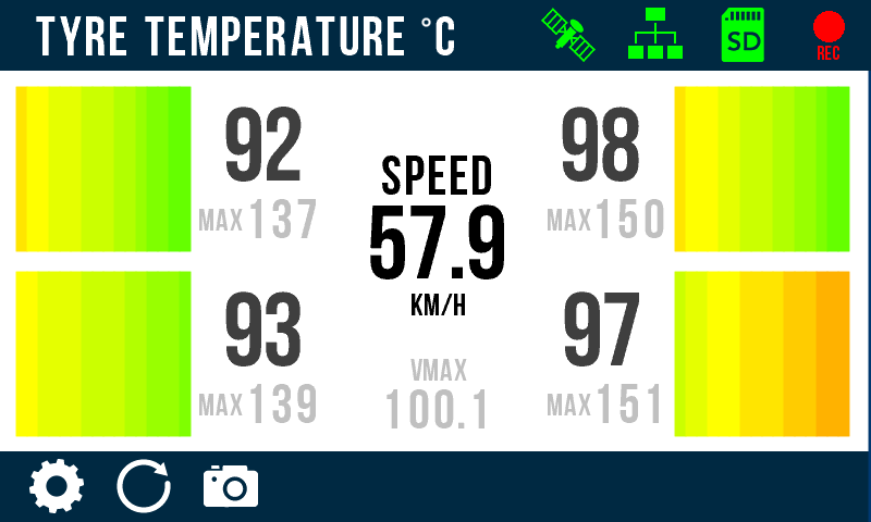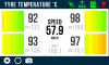 Measure, log and display the surface temperature of all 4 tyres in real-time on the VBOX Touch. The responsive, colour display offers a visual representation via 64 individual heat maps, as well as live and maximum temperature values.