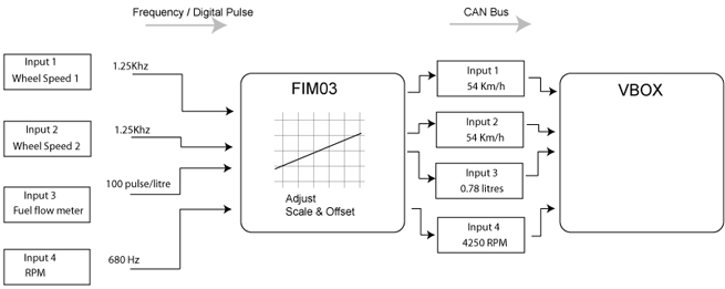 Racelogic's Frequency Input Module (RLVBFIM03) is a 4-channel frequency capture and pulse counter unit which enables frequency based signals in the range of 1 Hz to 20 kHz to be recorded or logged by a VBOX.