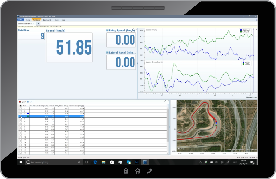 VBOX Test Suite installed on a Windows device within the test vehicle offers real-time display of all measured parameters, either by a serial, USB, or Bluetooth connection.