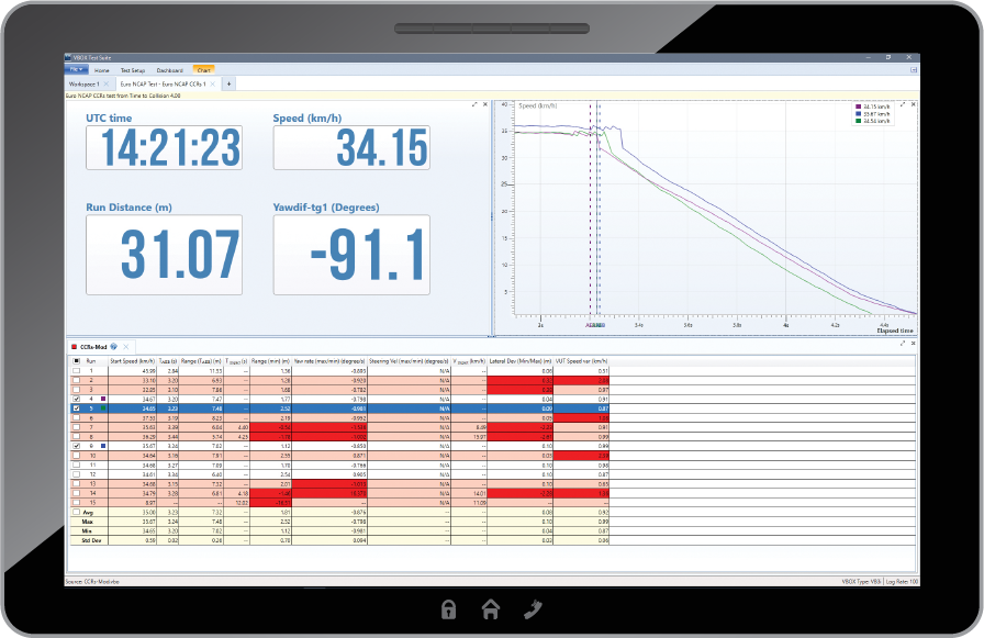 Alle Daten können in Echtzeit angezeigt oder nachträglich mit unserer intuitiven Datenanalysesoftware ausgewertet werden. VBOX TEST SUITE bietet fünf spezielle ADAS-Test-Szenarien, die das Testen nach allen relevanten Standards vereinfachen.