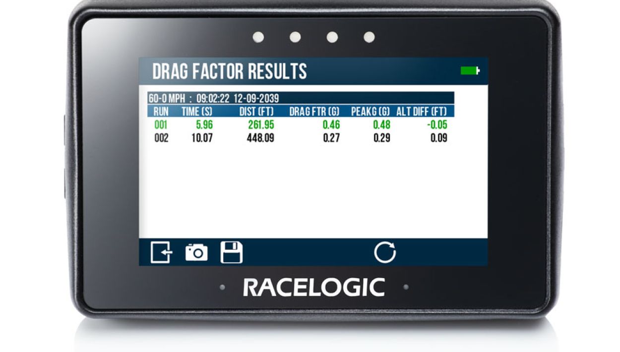 Measure drag factor from controlled braking/skid tests, validate average speed over a known distance, and record longitudinal and lateral G-force.