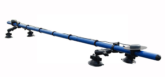 Dieser dreiteilige Teleskop-Montagearm (RLACS212-v2) wird im Fahrzeug zwischen dem Fahrzeugdach und dem Boden festgeklemmt. Es ist auf eine Länge von 70 bis 150 cm einstellbar, zu der weitere 20 cm hinzugefügt werden können, indem ein dritter Abschnitt über dem Kompressionshebel befestigt wird. Beide Enden sind an einer 8 x 13 cm großen Platte befestigt, die auf einer Gelenkverbindung sitzt, um unebene Oberflächen auszugleichen. Die IMU kann an die mitgelieferte Halterung (RLACS294) angeschraubt werden, die selbst fest mit dem Teleskoparm verschraubt ist.