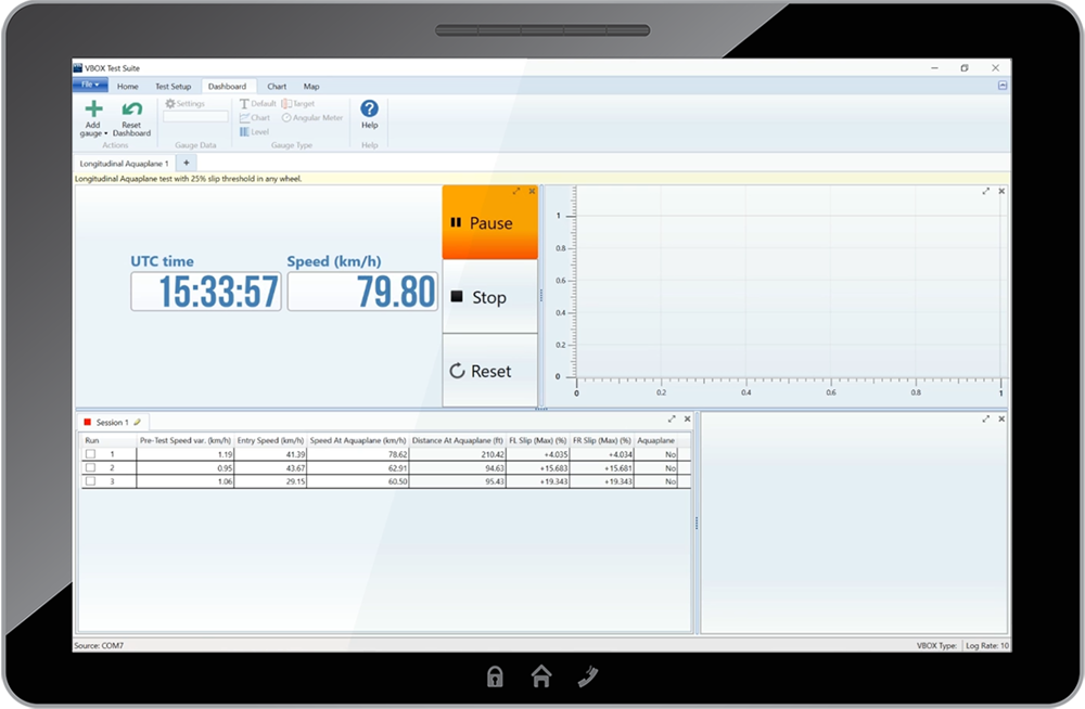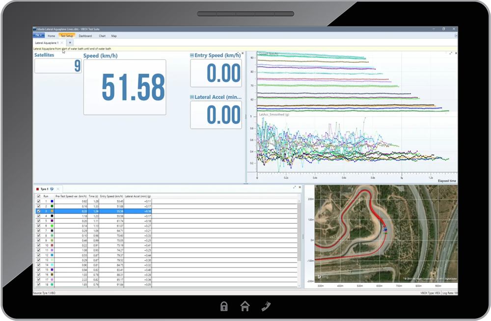 Die VBOX Test Suite Software ist mit speziellen Plugins für Längs- und Queraquaplaning-Tests vorinstalliert, um die Einrichtungszeit zu verkürzen. Alle gemessenen Parameter können während des Testvorgangs in Echtzeit mit einem Windows-basierten Tablet oder Laptop angezeigt werden.