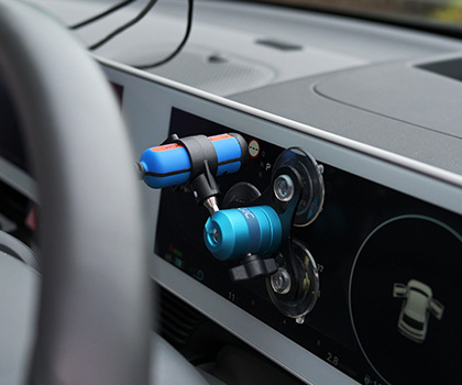 Ein ideales SLIF-Testsetup besteht aus einer VBOX Touch, einer Event Marker Box und einer VBOX HD2 Videoeinheit, wobei die Kamera so positioniert wird, dass sie sowohl die Straße als auch das Armaturenbrett mit der SLIF-Anzeige erfasst.