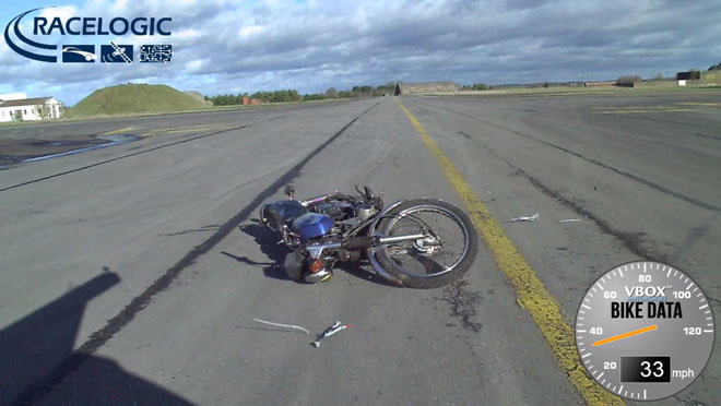 The VBOX Micro, connected to a GPS combiner and two antennas – to ensure continuity of satellite lock when the bike falls onto its side – is packed into the seat unit with a battery pack. The bike is then towed up to a set speed and ‘dropped’ so that it falls and skids along the runway. The test is filmed by a rear-facing VBOX Video camera system.