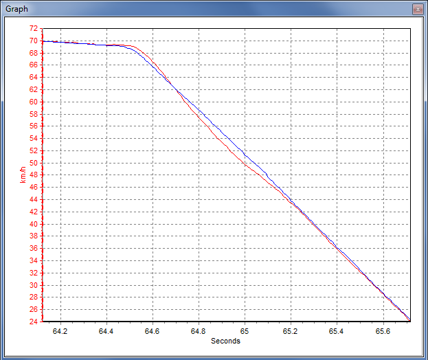 To show an example, here are three brake stops which were carried out using a low, medium and high frequency response setting on the GPS engine. The blue trace is the reference (IMU-corrected) vehicle speed, and the red trace is the GPS measured speed. You can see as the frequency response gets higher, the over/undershoot of the velocity gets smaller.