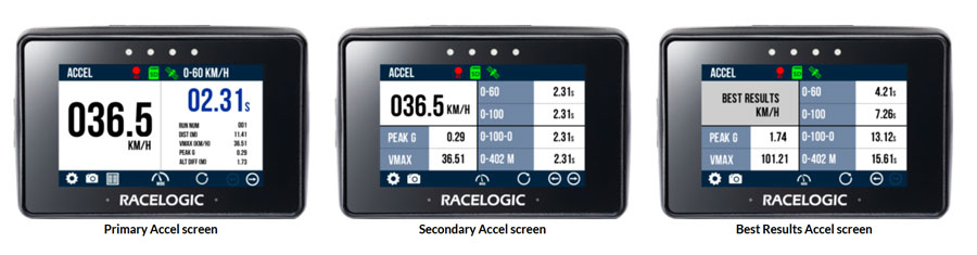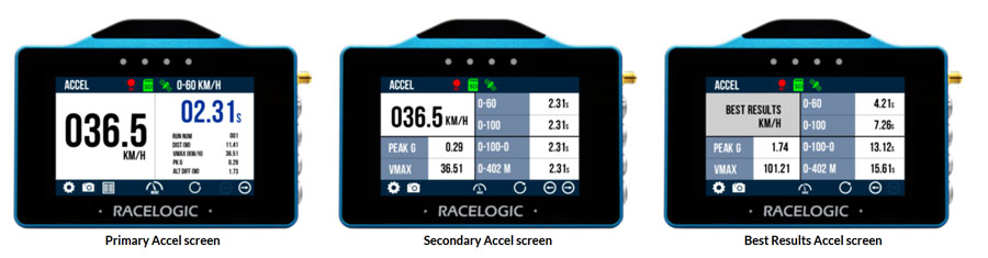 It is now possible to conduct 4 concurrent acceleration tests, visible via 2 new acceleration screens - Secondary and Best Results. The new screens can be accessed by selecting the Forward and Back arrows on the bottom right of the screen when within Accel Mode or by swiping the screen left or right.