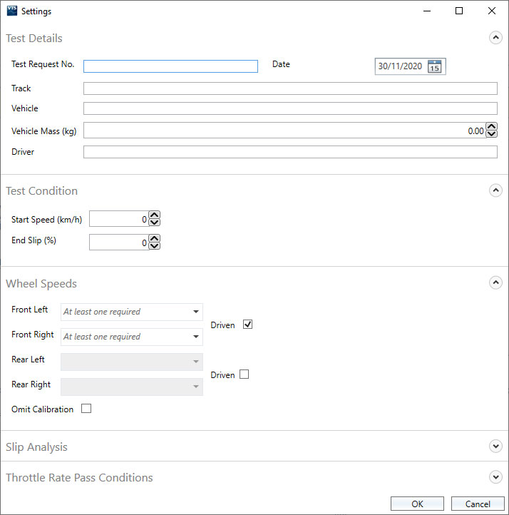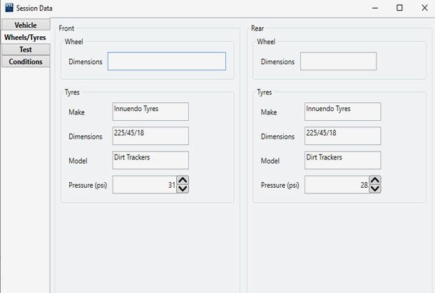 The software allows you to enter session-specific information for each test, that defines test conditions and vehicle details. This includes fields such as tyre dimensions, vehicle model, weather and temperature. The information is automatically saved to the log file and only needs to be entered once, it can also be exported for use in another file, saving setup time.