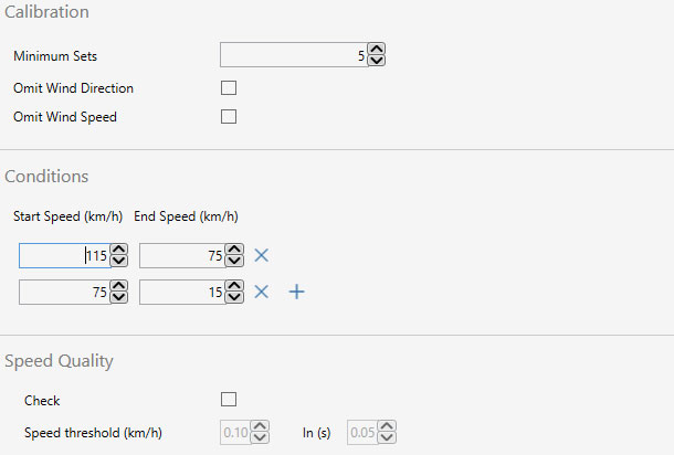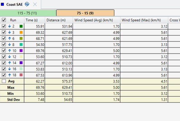 The software can add extra test intervals by splitting the test into different speed ranges. This is especially useful for the SAE J2263 test which requires the runs to be completed in pairs of differing directions. If the full coastdown cannot be completed in a continuous run, then the ‘Split Run’ option in the test settings can be used to combine the high and low speed portions into one complete coastdown run.